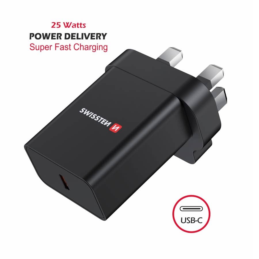 The charger has a USB-C output port with Powerdelivery technology for both Apple and Super fast charging for Samsung, a fork for UK sockets and 25W output power. Packed in a SWISSTEN retail pack.