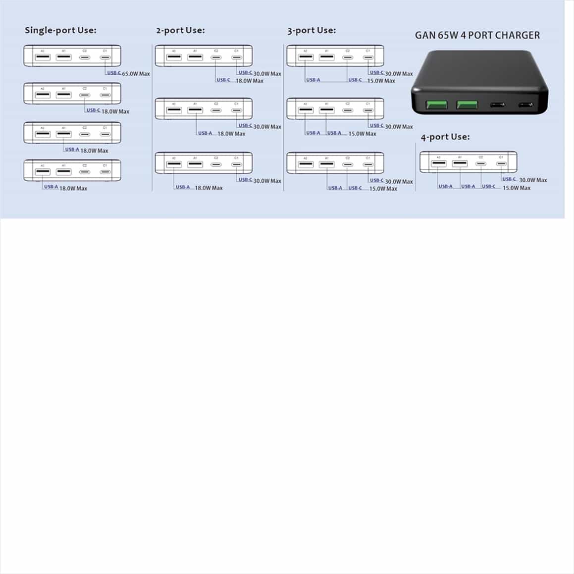The charger has a high output power of 65W from USB-C port 1. The other ports charge with a maximum power of 18W and when connecting multiple devices, the output power of each output port is optimized.