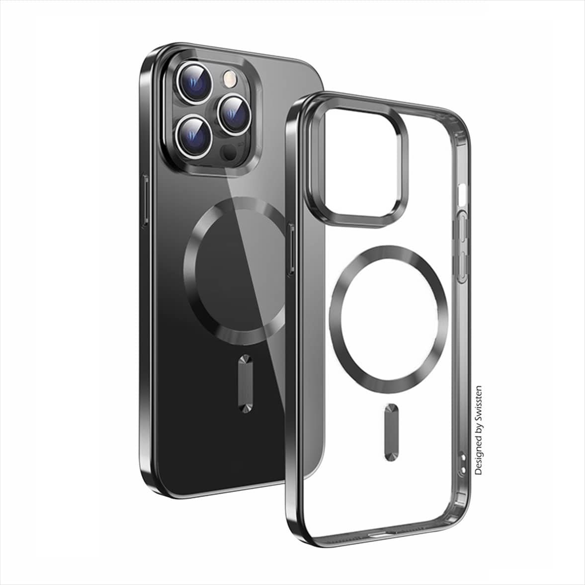 Luxurious clear case SWISSTEN MagStick Metallic with an elegant black frame and metallic accessories. Suitable for MagSafe charging. Packed in a SWISSTEN blister